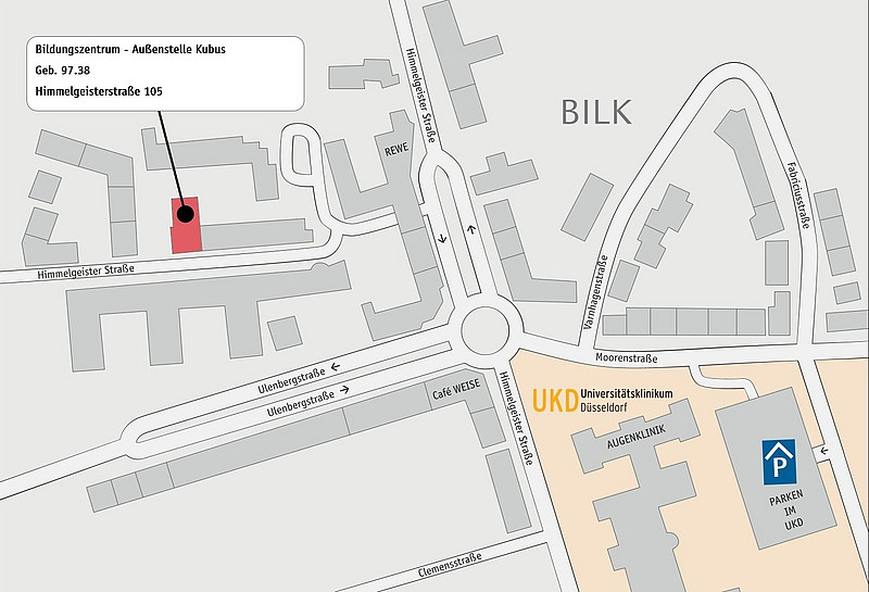 Bitte beachten Sie, dass das Parken auf dem Gelände des Universitätsklinikums Düsseldorf beschränkt möglich und kostenpflichtig ist.