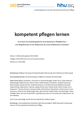 Das Düsseldorfer Curriculum kompetent pflegen lernen ist das Schulinterne Curriculum des Ausbildungszentrums für Gesudnheitsberufe Fachbereich Plfege und ist in der Version 2.0 (Stand 22.02.2022) aktualisiert worden. Es steht auf der Startseite des Fachbereichs Pflege für alle Interessierten mit einigen Anlagen zum zum Download bereit.
