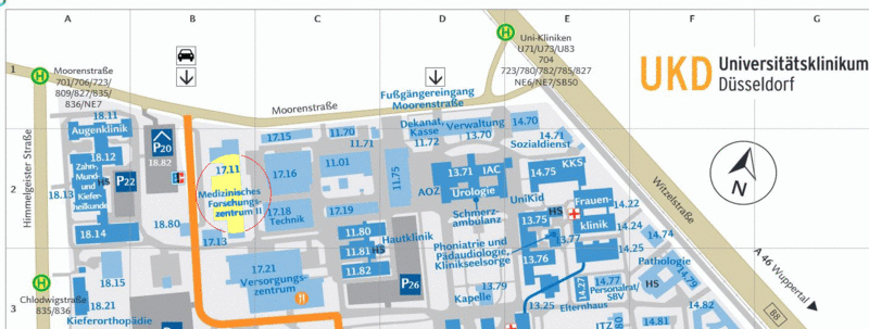 From tramway 704 stop Universitaetsklinik right into Moorenstrasse, pass pedestrian entrance University Clinics and walk down Moorenstr. to the automobile entrance and find the newly erected building 17.11 left of barriers and gatekeepers cf. map.