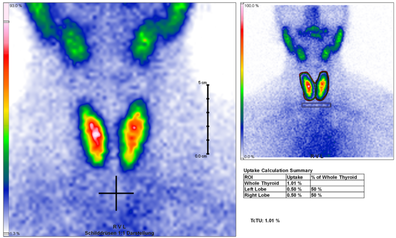 放射性ヨウ素内用療法は、甲状腺機能亢進(バセドウ病など)や、甲状腺がんの治療を目的として行われます。放射性ヨウ素のカプセル投与によって、甲状腺の機能亢進した部位や、甲状腺ガン手術後に残った器官部位が選択的に非活性化されます。手術と異なり、病変を示していない器官の損傷を最低限に抑えることが出来ることが長所の一つです。治療に際しては、3-7日程度の入院が必要になります。治療に際し、放射性ヨウ素の量は、各病態に応じて、事前のシンチグラフィーなどのテスト結果などをもとに計算されます。現在、当科では新しい治療病棟建設プランが進行中ですので、それまでは治療をご希望の方にはデュッセルドルフからアクセスの良い近隣の総合病院をご紹介しております。甲状腺一般の診療・ご相談、治療に関するご質問などは、当科にて常時受け付けておりますので、ご遠慮なくお訊ねください。