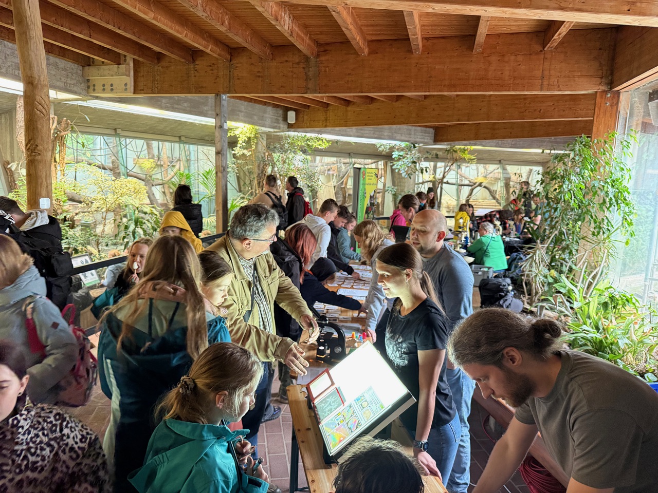 Natürlich hat „Vimoto", der Silberrücken wieder ganz entspannt beobachtet, wie wir über die Gehirne seiner Art im Vergleich zu Orang-Utans, Meerkatzen, Kängurus, Hausschweinen, Meerschweinchen, Ratten, Vögeln, Fröschen, Krokodilen und natürlich auch uns Menschen mit den neugierigen Zoobesuchern Informationen ausgetauscht haben. Den Namensgebern unseres Institutes sei Dank, dass sie so umfangreich gesammelt haben und dabei immer alle Lebewesen im Blick hatten! Mancher Spaß entstand im Gespräch und es war wieder ein toller Tag. Manch einer entdeckte gleich das ein oder andere Talent am Polarimeter oder zeigte außergewöhnliche Fähigkeiten beim Memory. Wir hoffen, dass wir unsere Begeisterung für das Thema  an unsere vielen kleinen und großen Gäste an unserem Stand weitergeben konnten.