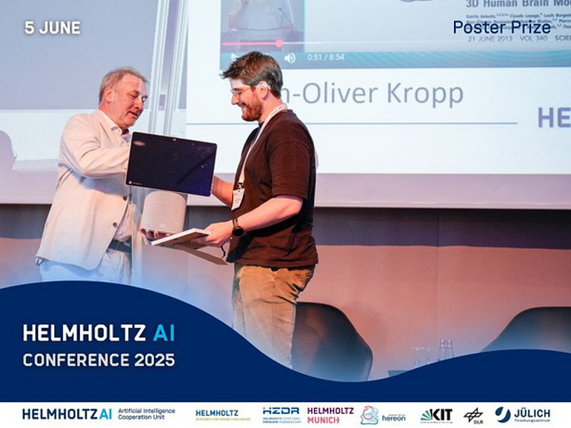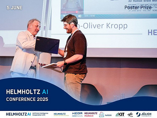 Jan-Oliver Kropp (Cécile & Oskar Vogt-Institut für Hirnforschung, INM-1 und Helmholtz AI) kam beim Posterwettbewerb der diesjährigen HAICON – der „Helmholtz AI Conference“ in Karlsruhe – auf den dritten Platz. Titel seines Posters: “Step by Step: Towards a gapless 1-micron BigBrain with Diffusion Models”. Das Publikum war die Jury und konnte aus dem Vollen schöpfen: Rund 100 Nachwuchswissenschaftler:innen traten mit ihren Postern beim Wettbewerb an. Das INM-1 war mit vier Postern dabei.