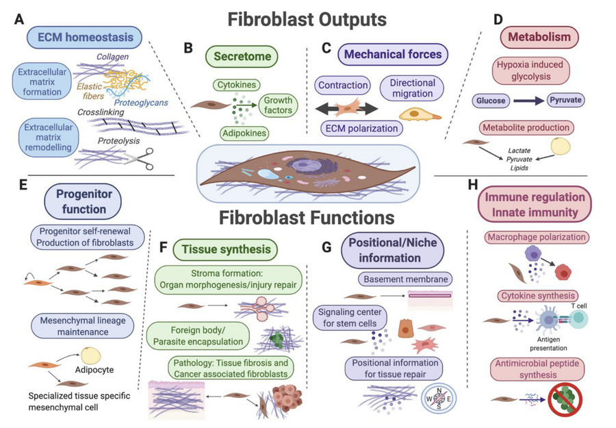 Key functions for fibroblasts (shown in the center) and their mesenchymal lineages include extracellular matrix (ECM) secretion and remodeling (A), secretion of signaling factors for surrounding cells (B), mechanical force generation (C), and regulation of tissue metabolism and metabolite secretion (D). Fibroblasts also function as progenitor cells for mesenchymal lineages (E), as “makers” of new tissue during organ morphogenesis, tissue repair and upon various pathological conditions (F), as sources of positional information across distinct anatomical regions of the same organ and as key signal contributors toward stem cell niches (G), as well as target cells and reciprocal modulators of diverse innate and adaptive immune functions (H).Plikus et al. Cell. 2021 Jul 22;184(15):3852–3872. doi: 10.1016/j.cell.2021.06.024