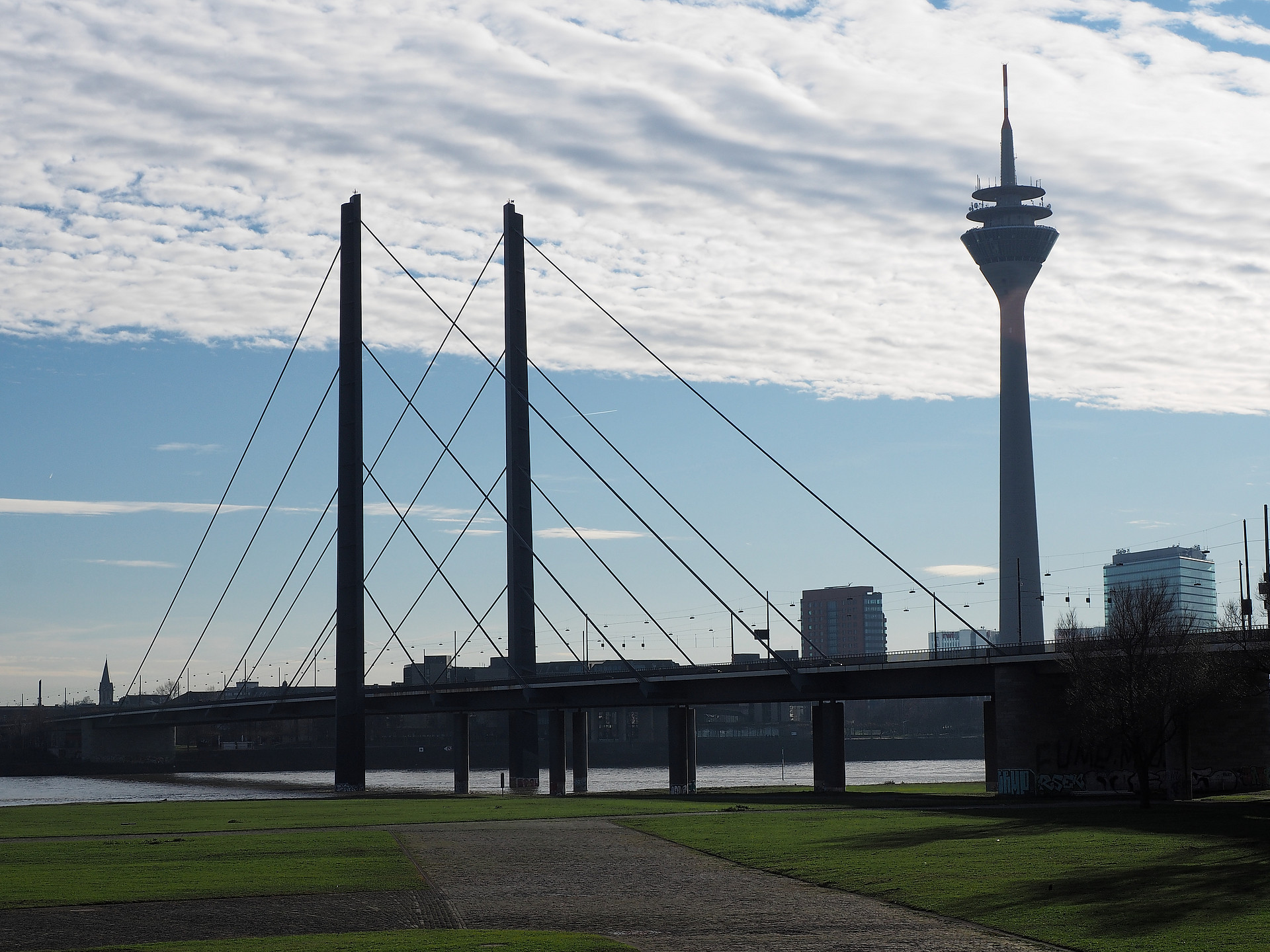 das bekannte Düsseldorfer Panorama mit dem markanten Fernsehturm neben dem vielfach gerundeten Landtag an der Rheinknie-Brücke,