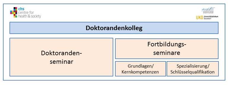 Für die Bereiche Grundlagen/Kernkompetenzen und Spezialisierung/Schlüsselqualifikation ist die Teilnahme sowohl an Veranstaltungen aus dem Ausbildungsprogramm der medRSD als auch an Veranstaltungen des Centre for Health and Society vorgesehen. Insgesamt müssen im Rahmen des Ausbildungsprogramms der medRSD und des chs Veranstaltungen im Umfang von mindestens 6 Creditpoints bzw. 6 Veranstaltungstagen belegt werden.