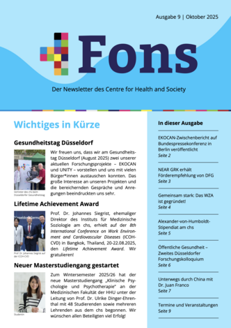 Unser Newsletter erscheint vierteljährlich und hält Sie über aktuelle Themen, Projekte und Veranstaltungen am Centre for Health and Society (chs) auf dem Laufenden. Er richtet sich an Mitarbeiter*innen sowie an alle, die an den Aktivitäten und Entwicklungen unserer Institute interessiert sind. Die erste Ausgabe des Newsletters "Fons" erschien im Oktober 2023.