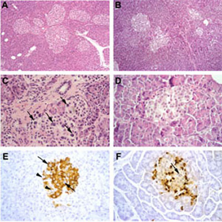 ![]() | Abb.: Pankreasinselpathologien bei Patienten mit adulter Nesidioblastose (A) im Vergleich zu physiologischen Kontrollproben (B). (A) In der niedrigen Vergrößerungsstufe zeigt das Pankreasgewebe irregulär geformte Inseln verglichen mit der Kontrolle (B). Die starke Vergrößerung deckt kleine periduktale Inselkomplexe auf, die Zellen mit hypertrophischen Nuclei (Pfeile in C) enthalten. (D) Reguläre Erscheinung von Inselzellen einer Kontrollprobe von einem Patienten ohne Nesidioblastose. Die immunhistochemische Färbung für Insulin (E) und Somatostatin (F) zeigt ein quantitativ normales Verteilungsmuster der beiden Hormone in den Inseln. Die endokrinen Zellen mit den vergrößerten Nuclei sind positiv für Insulin (Pfeil in E), aber nicht für Somatostatin (Pfeil in F). |