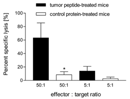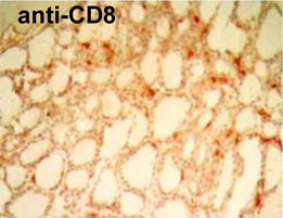 | In einer kürzlich publizierten Studie (Clinical Cancer Research 2008) konnte in einem transgenen Tiermodell für das medulläre Schilddrüsenkarzinom erstmals gezeigt werden, dass eine Immunisierung mit einem Aminosäure-veränderten Polypeptidhormon zu einer Antigen-spezifischen Immunreaktion führt. Die Antigen-spezifischen zytotoxischen T-Zellen (CD8+) infiltrieren die Tumore, wohingegen Kontrollprotein-immunisierte Mäuse keine Infiltration zeigen. Weiterhin konnte gezeigt werden, dass die zytotoxischen T-Zellen medulläre Schilddrüsenkarzinom-Zellen in vitro abtöten können. Die therapierten Mäuse zeigen um etwa 75% kleiner Tumore sowie deutlich erniedrigte Tumormarker. Bei einigen der therapierten Mäuse war kein Tumor mehr nachweisbar. | |