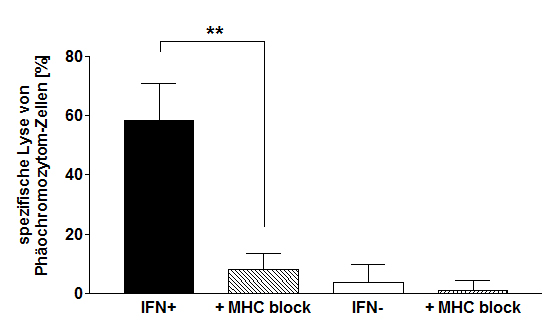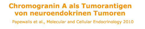 | In einer kürzlich von der Arbeitsgruppe von Prof. Schott publizierten Arbeit konnte weltweit erstmalig gezeigt werden, dass das neuroendokrine Tumorzell-spezifische Oberflächenmolekül Chromogranin A (CgA) auch als Tumorantigen fungiert. Auf der Basis eines Mausmodells konnte bewiesen werden, dass nach Immunisierung mit CgA-Peptiden eine CgA-spezifische Immunität induziert wird. Dies führt zur Infiltration von ex vivo applizierten Tumoren (Abbildung A) und eine Lyse von Tumorzellen durch aktivierte (Interferon gamma-sezernierende) T-Lymphozyten (Abbildung B). | |