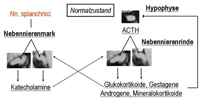 ![]() | Untere Abbildung: Die vermehrte Produktion von Adrenalin in der einen Nebenniere und die vermehrte Produktion von Glukokortikoiden in der anderen verstärkt sich peripher gegenseitig. |