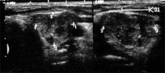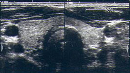 Die Sonographie mit hoch auflösenden Schallköpfen (7,5 bis 12,5 MHz mit Duplex) stellt heute bereits wenige Millimeter große Herdbefune präzise dar. Es existieren sonographische Kriterien, auf deren Basis, maligne Schilddrüsenknoten mit sehr hoher Sicherheit identifiziert werden können. Hierzu gehören unter anderem die Hypoechogenität, die unregelmäßige Randbegrenzung, Mikroverkalkungen sowie eine zentral verstärkte Vaskularisation.