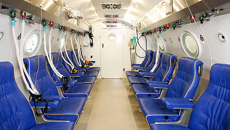 Die Hyperbare Sauerstofftherapie (HBO) des Universitätsklinikums Düsseldorf verfügt über eine moderne und geräumige Mehrpersonendruckkammer mit integrierter Personenschleuse. Die räumlich-maximale Belegung der Druckkammer beträgt 12 Personen. Es werden allerdings nie mehr als 6 Patienten gleichzeitig behandelt, da bei jedem Patienten in jeder Therapieeinheit unabhängig von der Schwere seiner Erkrankung immer eine kontinuierliche Überwachung des Sauerstoffpartialdrucks (pO2) stattfindet. Diese Überwachung stellt eine wichtige Sicherheitsmaßnahme für den Patienten dar. Und: sie hilft die Behandlungsqualität einer jeden HBO-Therapieeinheit sichern. Während man in der „herausgeschnittenen Flugzeugkabine bequem sitzt“ (Originalton eines kleinen Patienten) bleibt weder der Komfort noch die Sicherheit außen vor: für den Komfort sorgen Musikprogramme mittels Radio, Kassette und CD sowie die bequemen Ledersitze. Für Behandlungen von liegenden oder schwer kranken Patienten lassen sich die Ledersitzreihen binnen 30 Sekunden entfernen und durch 3 Standard-Krankenhausbetten oder 4 Rettungsdienstliegen ersetzen.