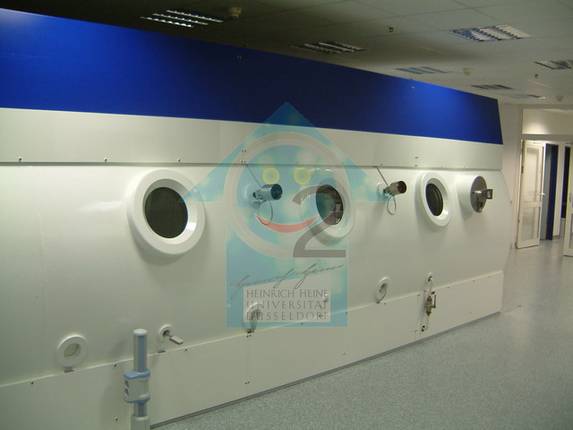 Die hyperbare Sauerstofftherapie des Universitätsklinikums Düsseldorf verfügt über eine Mehrpersonendruckkammer mit einer Kapazität von 12 sitzenden und 4 liegenden Patienten (bezogen auf Erwachsene). Hersteller der Kammer ist Sayers & Hebold Druckkammersysteme. Die Kammer wurde von Draeger Safety umfangreich modifiziert (Atmungssystemverbesserung, Nitrox-Anlageninstallation).