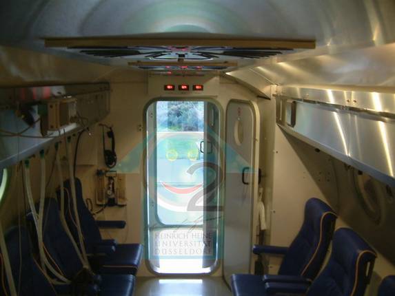 Die Druckkammer besteht dabei auch einem großen Behandlungsraum und einer kleineren Schleuse. In dem großen Behandlungsraum finden die HBO-Therapieeinheiten statt. Die Schleuseneinheit mit einer Kapazität von 4 Sitzplätzen dient zum Schleusen von Personal und/oder Patienten in den großen Behandlungsraum, ohne dabei dessen Überdruck absenken zu müssen.