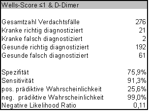 Tabelle 1: Diagnostische Treffsicherheit von Wells-Score in Kombination mit D-Dimer-Test