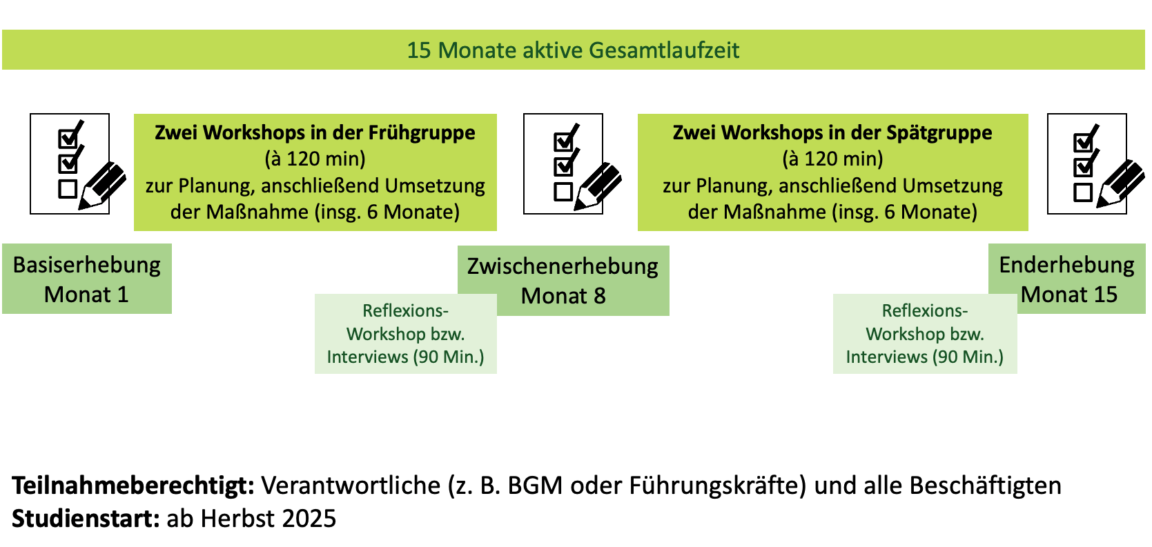 Das Projekt startet nach informiertem Einverständnis mit einer online-Befragung aller Teilnehmenden, die im Anschluss als Team der Frühgruppe oder der Spätgruppe zufällig zugelost ("randomisiert") werden. Die Frühgruppe beginnt mit einem zweistündigen Workshop, in dem Mitarbeitende nützliches Wissen aus der Forschung zu Naturkontakten von den Projektmitarbeitenden vermittelt bekommen. In diesem ersten Workshop werden gemeinsam erste Ideen für naturbasierte Maßnahmen entwickelt und an die bestehende betriebliche Realität angepasst. Die Vorschläge werden dann im Team und mit Entscheidungsträger*innen durchgesprochen. In einem zweiten Workshop findet die konkrete Planung statt, anschließend die Umsetzung der priorisierten Maßnahme(n). Begleitet wird der gesamte Prozess durch erfahrene Projektmitarbeitende als unterstützende Moderator*innen, die besonders auf einen fairen Umgang, soziale Gerechtigkeit und die Einbindung aller achten. So kann nicht nur die Naturverbundenheit, sondern auch der Zusammenhalt im Team gestärkt werden. In einem Reflexionsworkshop, der auch als Teamentwicklungsmaßnahme dient, werden Erkenntnisse bezüglich des Prozesses und der Gruppendynamik reflektiert. Nach der zweiten, anschließenden Datenerhebung wird dieser Ablauf mit der Spätgruppe wiederholt. Abbildung 1 veranschaulicht den Ablauf:
