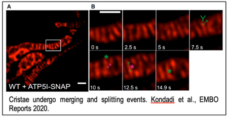 Mitochondria play important roles in a variety of cellular processes including ATP conversion, apoptosis, calcium buffering and iron-sulphur cluster biogenesis. The application of electron microscopy (EM) and tomography to mitochondria in the 1950’s and 1990’s revealed the mitochondrial ultrastructure. Despite indirect evidences, the cristae membranes were considered as static structures as the data was derived from EM and ET. Recently, we showed that cristae membranes are continuously moving within individual mitochondria. Cristae merge and split within a timescale of seconds. This novel finding has opened up many interesting questions about the relationship between the internal milieu of mitochondria and its functioning.