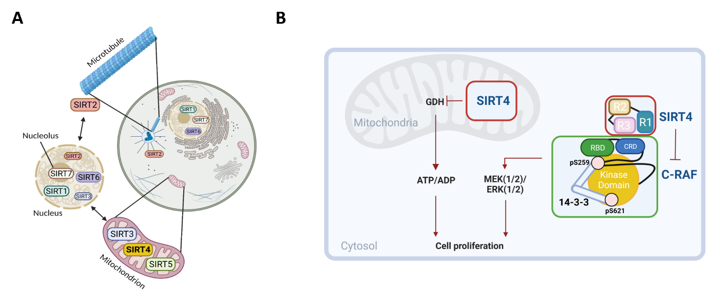 Sirtuine stellen eine Familie NAD+-abhängiger Enzyme dar, die an der Regulation verschiedener zellulärer Prozesse beteiligt sind, darunter Genexpression, Stoffwechsel und Proliferation (Abb. 1A). Unser Labor konzentriert sich auf die biochemische und zellbiologische Charakterisierung der primär in Mitochondrien lokalisierten Sirtuine, i.e., SIRT3, SIRT4 und SIRT5. Im Besonderen untersuchen wir die subzellulären Funktionen von SIRT4 im Rahmen der Regulierung der Mitochondriendynamik, Autophagie und Zellproliferation. SIRT4 ist in seiner Rolle als metabolischer Tumorsuppressor in Mitochondrien gut charakterisiert und verstanden. Eine erhöhte SIRT4-Expression, bedingt z.B. durch genotoxischen Stress im Zellzyklus, hemmt die zentralen Stoffwechselenzyme Pyruvatdehydrogenase (PDH) und Glutamatdehydrogenase (GDH) und reduziert dadurch die ATP-Produktion und Proliferation. Zusätzlich zu seiner mitochondrialen Rolle lokalisiert SIRT4 subzellulär auch außerhalb der Mitochondrien, wo es bisher unklare Funktionen in der intrazellulären Signalübertragung und Proliferationskontrolle einnimmt. In diesem Zusammenhang konnte unsere Gruppe in neueren Arbeiten mehrere zytosolisch lokalisierte Proteine als Interaktions-/Bindungspartner von SIRT4 identifizieren. Interessanterweise bindet SIRT4 an C-RAF/RAF1, einem Mitglied der RAF-Kinasen, mit einer augenscheinlich negativen Auswirkung auf den MAPK-Signalweg (Abb. 1B). Unsere aktuellen Arbeiten haben daher die Charakterisierung der molekularen Grundlage der SIRT4-C-RAF-Interaktion und deren Bedeutung für nachgeschaltete Signalwege und zelluläre Prozesse zum Ziel.