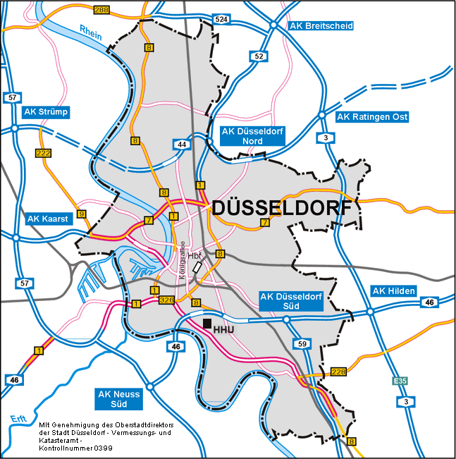 Das Institut für Biochemie und Molekularbiologie befindet sich im 5. Stock des Gebäudes 22.03. auf dem Gelände der Heinrich-Heine-Universität (orange dargestellt). Zugang zum Gebäude haben Sie über den Haupteingang am Roy-Lichtenstein-Saal und über den Hintereingang an der Universitätsstraße. Sie erreichen uns mit den Bussen 835 und 836 ab S-Bahnhof Bilk, Haltestelle Universität West, oder mit der Straßenbahn 707 (beides rot dargestellt), Haltestelle Universität Ost / Botanischer Garten. Mit dem Auto gelangen Sie über die A46, Ausfahrt Universität, bzw. Ausfahrt Benrath, zu uns (grün dargestellt).
