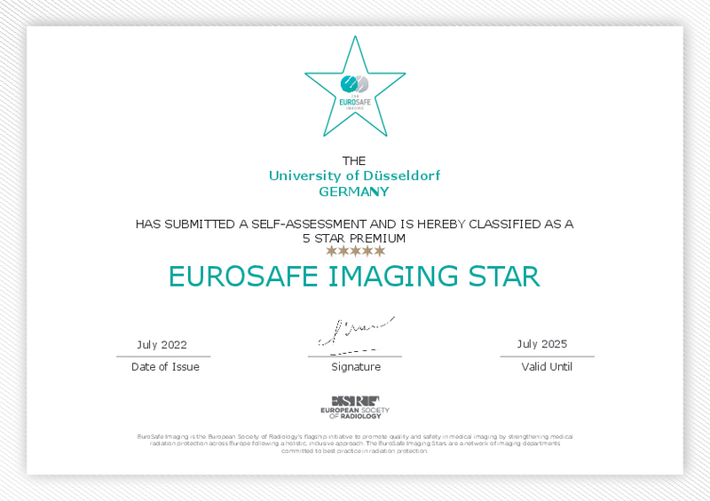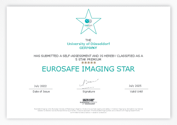 Unsere Bemühungen beim Strahlenschutz wurden von der Europäischen Röntgengesellschaft mit der höchstmöglichen Anzahl von fünf Sternen (Premium) bei Eurosafe Imaging ausgezeichnet. Die Wall of Stars von Eurosafe Imaging finden Sie hier: https://www.eurosafeimaging.org/stars/wall-of-stars