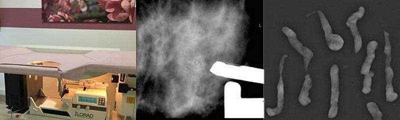 Sie liegen dafür in Bauchlage auf einer Liegevorrichtung mit Mammographie-Gerät (Abb. unten links). Der zu untersuchende Bereich der Brust wird leicht komprimiert. Mittels Mammographie-Aufnahmen der auffälligen Region werden die Veränderungen in der Brust aufgesucht und die Biopsie am Computer geplant. Nach gründlicher Desinfektion der Haut und lokaler Betäubung wird die Biopsienadel computergestützt platziert. Anschließend werden Gewebeproben zielgenau entnommen (Abb. unten Mitte). Die Entnahmestelle wird mit einem kleinen Metallclip (Titanclip) markiert. Im Falle von abklärungsbedürftigen Mikroverkalkungen erfolgt unmittelbar nach der Biopsie eine Röntgenkontrolle der entnommenen Proben um nachzuweisen, dass eine relevante Menge Kalk entfernt wurde (Abb. unten rechts). Der Eingriff dauert ca. 30 Minuten. Nach einer Beobachtungszeit von ca. 60 Minuten wird eine Kontrollmammographie angefertigt und ein Kompressionsverband angelegt, danach können Sie nach Hause gehen. Die entnommenen Gewebeproben werden im Institut für Pathologie des Universitätsklinikums Düsseldorf untersucht.