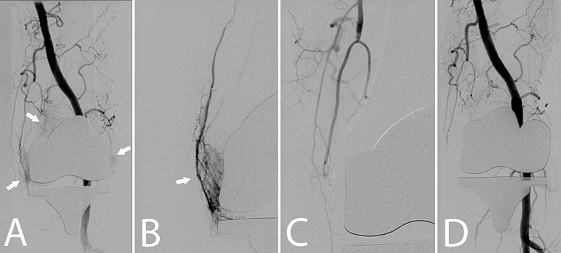 - Successful Selective Embolization for Recurrent Hemarthrosis after Knee Arthroplasty. Barrientos C, Barahona M, Cermenati T, Wulf R, Hinzpeter J. Case Rep Orthop. 2019 Dec 5;2019:8374709. doi: 10.1155/2019/8374709. eCollection 2019.