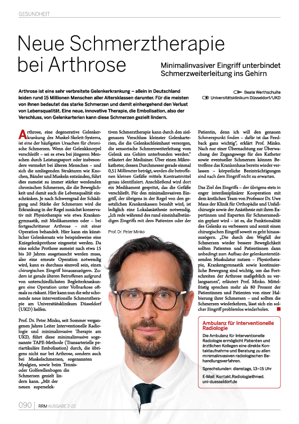 Die interventionelle Schmerztherapie in Form des Verschlusses (Embolisation) z.B. der A. genicularis (Kniegelenksarterie; Geniculararterienembolisation = GAE oder auch transarterielle periartikuläre Embolisation = TAPE) stellt eine neue Form der Therapie bei der Arthrose dar. Die initialen Ergebnisse dieser Methode am Knie-, Schulter und Schultereckgelenk (AC-Gelenk) sind seit den ersten veröffentlichten Studien 2015 vielversprechend.
