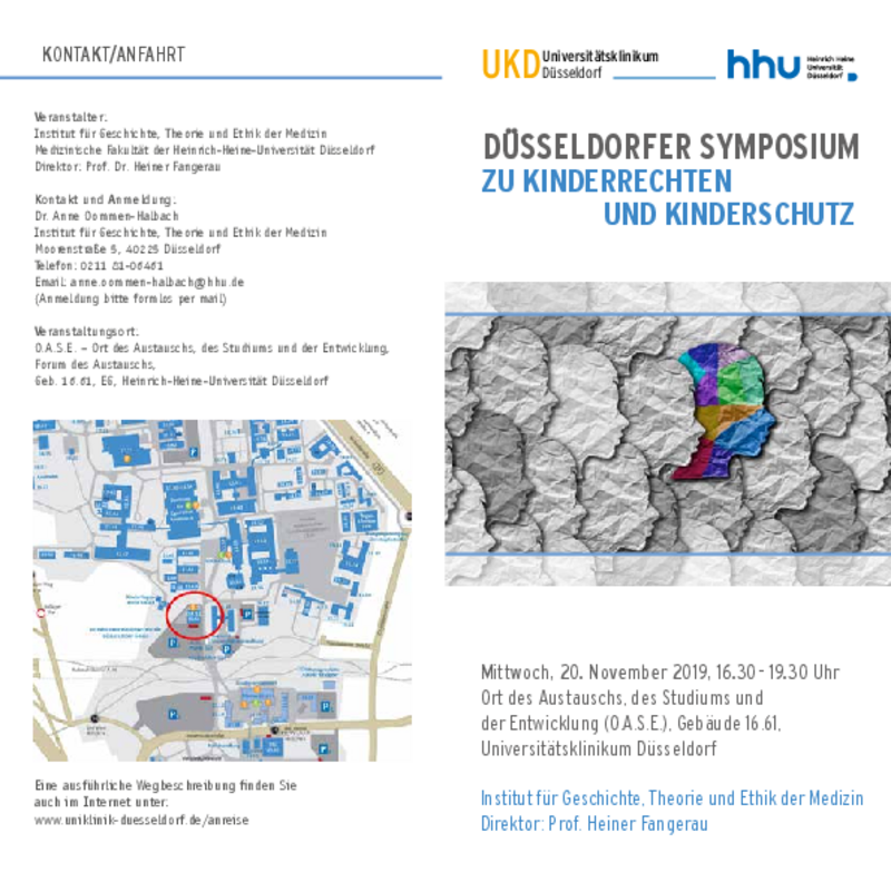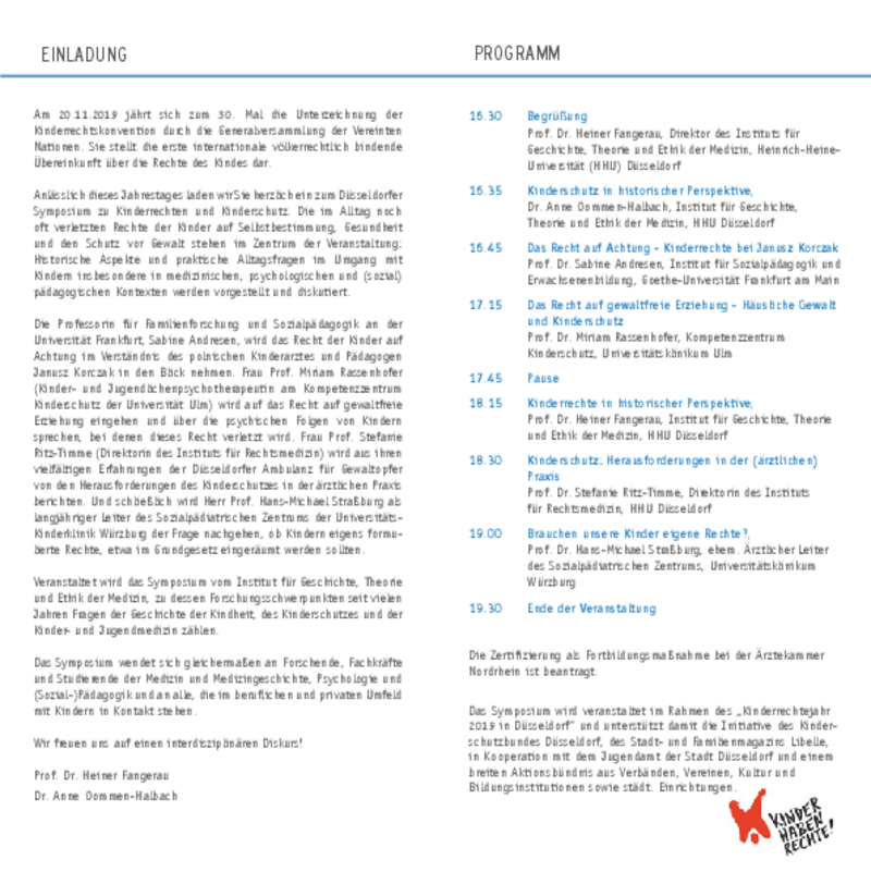 Anlässlich des 30. Jahrestages der Unterzeichnung der UN-Kinderrechtskonvention veranstaltet das Institut für Geschichte, Theorie und Ethik der Medizin ein wissenschaftliches Symposium mit Experten aus der Kinderheilkunde, Rechtsmedizin, Kinder- und Jugendpsychiatrie sowie der Familienforschung zu Fragen der Kinderrechte sowie des Kinderschutzes vor häuslicher Gewalt