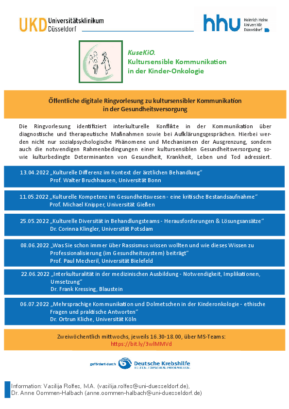 Die öffentliche digitale Ringvorlesung identifiziert interkulturelle Konflikte in der Kommunikation über diagnostische und therapeutische Maßnahmen sowie bei Aufklärungsgesprächen. Hierbei werden nicht nur sozialpsychologische Phänomene und Mechanismen der Ausgrenzung, sondern auch die notwendigen Rahmenbedingungen einer kultursensiblen Gesundheitsversorgung sowie kulturbedingte Determinanten von Gesundheit, Krankheit, Leben und Tod adressiert.