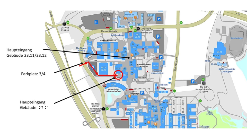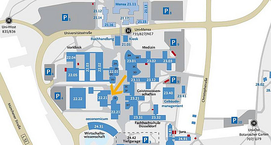Weitere Umgebungs- und Lagepläne der Heinrich-Heine-Universität sowie Fahrplanauskünfte finden Sie hier
