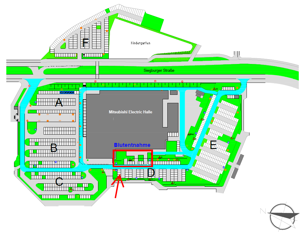 Die Blutabnahme findet in der Mitsubishi Electric Halle statt (Siegburger Str. 15, 40591 Düsseldorf).