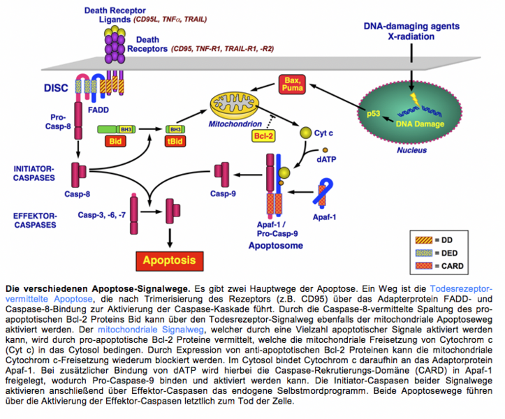 Der programmierte Zelltod spielt eine maßgebliche Rolle bei der embryonalen Morphogenese, der Elimination von Tumorzellen, virus-infizierten Zellen und autoreaktiven Thymozyten. Darüberhinaus stellt die Apoptose einen natürlichen Gegenspieler zur Zellproliferation dar und ist daher maßgeblich für die Aufrechterhaltung der Homöostase beim Zellumsatz verantwortlich. Es sind mittlerweile verschiedene Signalwege identifiziert worden, über die das endogene Selbstmordprogramm ausgelöst werden kann. Der sogenannte 'Todesrezeptorsignalweg' wird nach Bindung von natürlichen Liganden an Oberflächenrezeptoren wie CD95 (Fas, Apo-1) und den Rezeptoren für TNF und TRAIL ausgelöst. Der 'mitochondriale Apoptoseweg' wird über DNA-Schäden und zelluären Stress in der Zelle aktiviert. Beide Signaltransduktionswege aktivieren Proteasen der Caspase-Familie, welche durch proteolytische Spaltung von vitalen Zellproteinen zum Tod der Zelle führen.