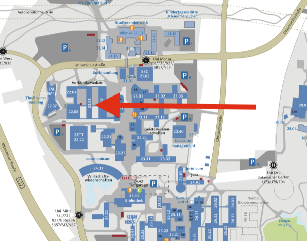 Die Autobahnausfahrt "Universität" wählen, weiter den Wegweisern folgen bis zur Universitätsstraße.