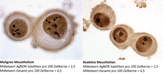 AgNORs sind mittels einer Silber-Färbung darstellbare Nukleolus organisierende Regionen. Ihre Anzahl und Größe ist mit der Proteinsynthese korreliert und kann zur Abgrenzung neoplastischer von nicht neoplastischen Zellveränderungen herangezogen werden. Insbesondere ist diese Methode hilfreich zur Abgrenzung einer nicht neoplastischen Mesothelhyperplasie von einem malignen Mesotheliom.