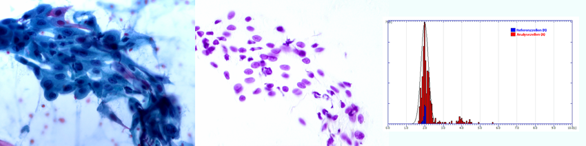 Die DNA-Bildzytometrie wurde maßgeblich vom ehemaligen Direktor des Instituts für Cytopathologie, Herrn Professor Böcking und auch seinem Nachfolger Herrn Professor Biesterfeld vorangebracht. Die Untersuchung bestimmt den DNA-Gehalt von Zellkernen nach Feulgen-Färbung eines Präparates. Die Intensität der Farbreaktion ist hierbei dem DNA-Gehalt proportional, so dass mit Hilfe eines Computer-gestützten Bildanalysesystems der DNA-Gehalt eines Zellkerns durch Messung der integrierten optischen Dichte (Messung von Kernfläche und Farbgehalt) bestimmt werden kann. Die Messung des DNA-Gehalts in einem zytologischen Präparat erfolgt an etwa 300 Analysezellen. Der DNA-Gehalt jeder einzelnen Zelle wird in einem Histogramm aufgetragen, welches so die Verteilung der zellulären DNA-Gehalte in einem Präparat zeigt. Zusätzlich wird der DNA-Gehalt von ca. 30 im Präparat enthaltenen unauffälligen Zellen (z.B. Granulozyten, normale Epithelien, Lymphozyten etc.) gemessen, welcher definitionsgemäß 2c ist, was einem diploiden Chromosomensatz entspricht.