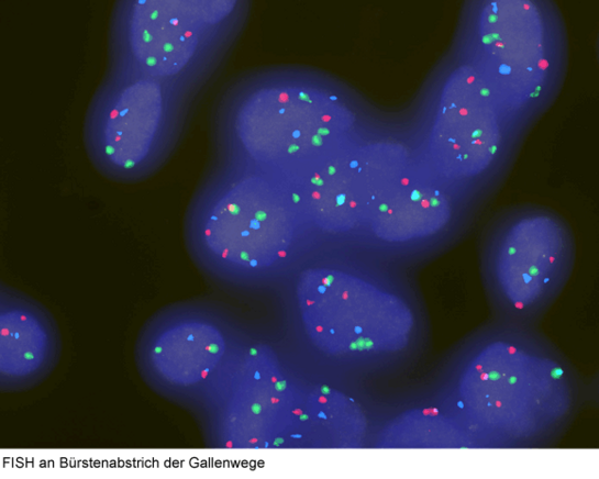 Aneusomie-Diagnostik mit Multicolour-FISH (UroVysion®, abbott molecular) wird zur weiteren Abklärung bei unklaren zytologischen Befunden der ableitenden Gallen- und Pankreasgänge (Bürstenabstriche) und in Feinnadelpunktaten des Pankreatobiliären Systems eingesetzt. Sowohl das duktale Pankreaskarzinom als auch das cholangiozelluläre Karzinom zeichnen sich durch einen hohen Grad der Aneusomie aus und können mittels FISH von entzündlichen oder reaktiven Zellveränderungen abgegrenzt werden.