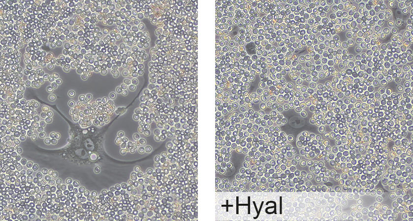 Die zellbiologischen Funktionen von HA hängen nicht nur von der HA-Menge, sondern auch von der Molekülgrösse ab. Durch die gezielte Spaltung der HA-Ketten in kleinere Fragmente (z.B. durch Hyaluronidasen bzw. Depolymerisation) entsteht ein individuelles Muster der HA-Grössenverteilung, welches mittels Gelelektrophorese und definierten HA-Standards in Zellüberständen quantifiziert werden kann.