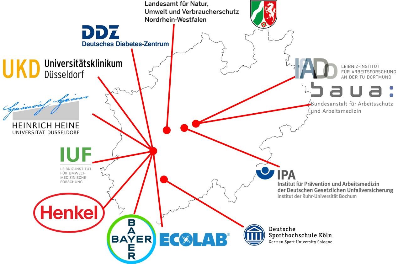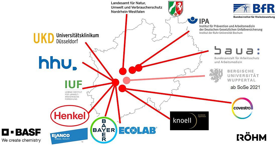 Im Raum Düsseldorf/Köln/Ruhrgebiet findet sich eine Konzentrierung toxikologischer Expertise mit dem einzigen Lehrstuhl für Toxikologie des Landes Nordrhein-Westfalen in Düsseldorf und leistungsfähigen Hochschul- und hochschulassoziierten Instituten in und um Düsseldorf, Dortmund, Essen, Bochum und Köln, die sich mit toxikologischen Fragestellungen beschäftigen. Dazu kommen Kontakte mit in der Region ansässigen Firmen der chemischen und pharmazeutischen Industrie und Behörden (siehe untenstehende Grafik). Eine Kerngruppe der an dem Masterstudiengang beteiligten Hochschullehrer blickt auf eine mehr als 20jährige Erfahrung in toxikologischer Lehre im Rahmen von drei durch die Deutsche Forschungsgemeinschaft (DFG) geförderten Graduiertenkollegs mit Düsseldorf als Sprecherhochschule zurück.