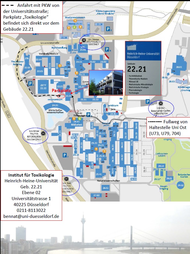 Mit dem Auto sollten Sie die "Universitätsstraße 1" als Ziel anpeilen. Sie sollten bei der Einfahrt zu Parkplatz P4 auf das Gelände fahren, dann immer weiter durch bis zu einer Sackgasse am Oeconomicum (das halbmondförmige Gebäude auf Säulen). Fahren Sie am Oeconomicum, dass dann zu Ihrer Rechten liegt, vorbei und parken Sie direkt vor dem Institut für Toxikologie rechts auf dem Parkplatz (siehe Lageplan). Der Parkplatz ist mit einem Schild "TOXIKOLOGIE" markiert. Alternativ befinden sich kostenlose Parkmöglichkeiten im Parkhaus unter dem Oeconomicum.