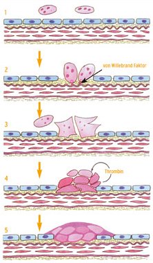 1. normaler Blutfluss, intakte Gefäßwand. 2. Verletzung der Gefäßwand, Blutplättchen heften sich über den von-Willebrand-Faktor an die verletzte Gefäßwand an. 3 + 4. Blutplättchen und Gerinnungsfaktoren werden aktiviert. 5. Blutplättchen und Gerinnungsfaktoren bilden eine Art "Wundkitt" und dichten die Verletzungsstelle ab.