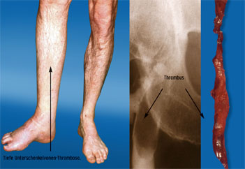 Im Hinblick auf Ursachen, Entstehungsmechanismus, Beschwerdebild, Art der Behandlung und Wahl der geeigneten Prophylaxe unterscheiden wir Thrombosen in der arteriellen und in der venösen Strombahn. Im schnell fließenden arteriellen System sind es vor allem arteriosklerotische Gefäßwandschädigungen, die eine Aktivierung der Thrombozyten auslösen und so zu einer Thrombusbildung in Herzkranzgefäßen (Myokard-Infarkt), hirnversorgenden Arterien (Schlaganfall), Äderchen am Augenhintergrund (Retinagefäßverschluss) oder Bein- und Beckenarterien (arterielle Verschlusserkrankung) führen. Im langsam fließenden venösen Stromgebiet ist demgegenüber Stillstand des Blutflusses („Stase“) in Verbindung mit einer abnorm gesteigerten Gerinnbarkeit („Hyperkoagulabilität“) Ursache von Thrombosen der tiefen Bein- und Beckenvenen. Die Entstehung von Venenthrombosen wird durch Ruhigstellung von Gliedmaßen (z.B. Gipsverband nach Knochenbruch) gefördert.