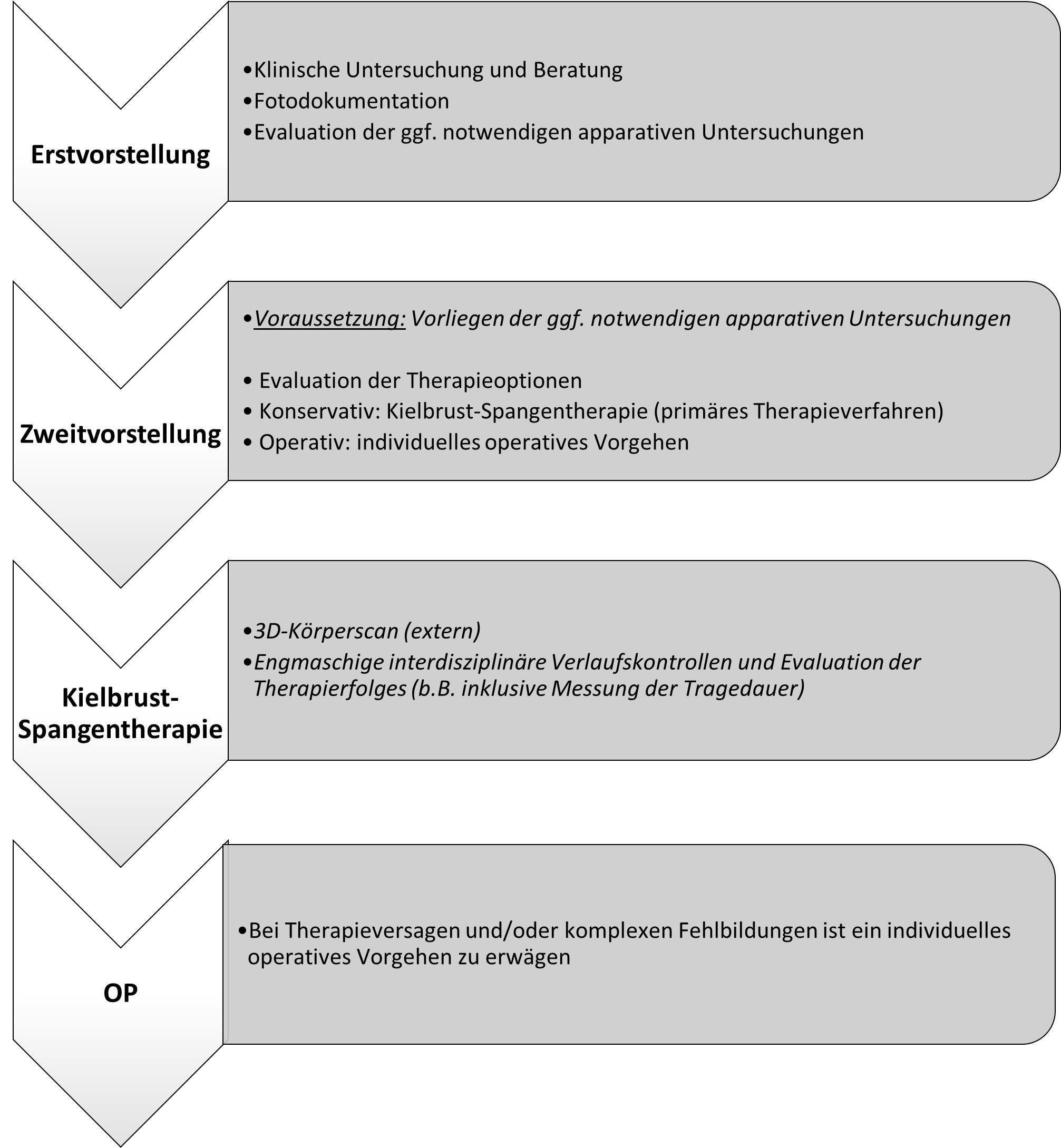 Entscheidend für den Therapieerfolg ist das konsequente und dauerhafte Tragen der Kielbrustorthese mit graduellem Ausschleichen bei erreichtem Korrekturziel sowie regelmäßigen Verlaufskontrollen.