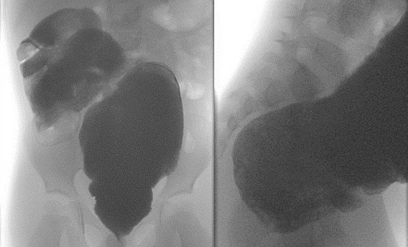 Der erste Schritt zur Diagnose ist ein ausführliches Anamnesegespräch, bei dem typische Symptome wie feste Stuhlballen, Schmerzen bei der Defäkation, Stuhlgang nur durch abführende Maßnahmen oder tagelang ausbleibender Stuhlgang erfragt werden. Es folgt eine körperliche Untersuchung, bei der Anzeichen wie ein geblähtes, schmerzhaftes Abdomen, tastbare feste Stuhlwalzen und erweiterte Dickdarmschlingen festgestellt werden können. Im Ultraschall lassen sich diese stuhlgefüllten, erweiterten Darmschlingen, einschließlich des Mastdarms, ebenfalls gut darstellen. Wenn die Ergebnisse dieser Untersuchungen auf Morbus Hirschsprung hindeuten, sollte eine Röntgenuntersuchung des Dickdarms mit Kontrastmittel (Kolon-Kontrasteinlauf) durchgeführt werden (Abbildung 1). Die endgültige Diagnose kann jedoch nur durch eine Rektumbiopsie gesichert werden.