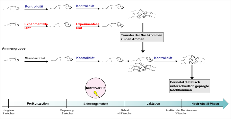 Auch die rein pränatale Exposition gegenüber einer maternalen hochkalorischen Ernährung hat dauerhafte metabolische und organische Veränderungen bei den Nachkommen zur Folge (Dahlhoff et al., Biochim Biophys Acta 2014). Diese Auswirkungen zeigten sich insbesondere bei den männlichen Nachkommen: Im Erwachsenenalter wiesen sie im Vergleich zur Kontrollgruppe eine gesteigerte Insulinresistenz, ein erhöhtes Körpergewicht und Körperfett als auch eine beginnende Lebersteatose mit Veränderungen im Genexpressionsprofil wichtiger Gene u.a. der de novo Lipogenese auf. Bemerkenswert an diesen Befunden ist, dass die Nachkommen durch den Transfer zu normalgewichtigen Ammen selbst nach der Geburt zu keinem Zeitpunkt einer hochkalorischen Diät ausgesetzt waren. Daraus lässt sich schließen, dass eine ungünstige Ernährung der Mutter in der Schwangerschaft ("nutritiver Hit") ausreicht, um das Risiko von metabolischen Störungen wie Lebersteatose und Typ-2-Diabetes im jungen Erwachsenenalter signifikant zu erhöhen.