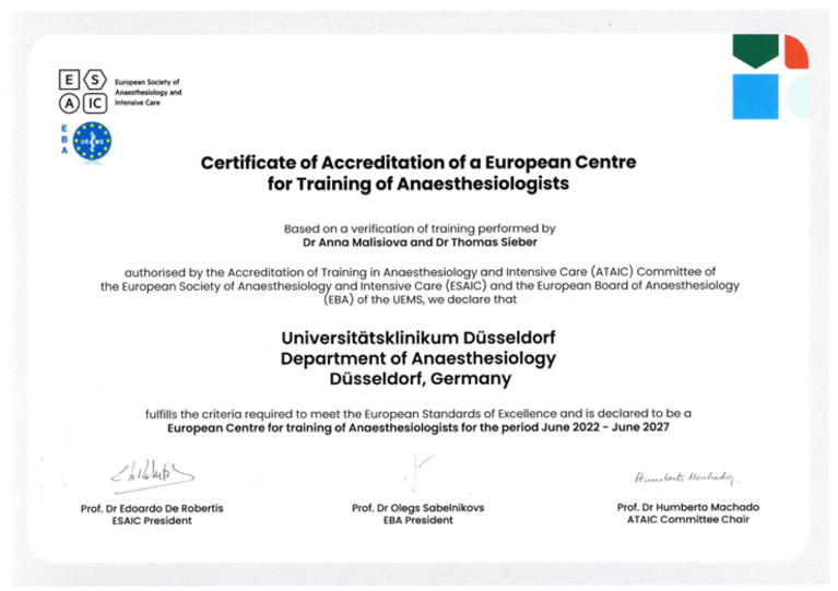 Im Rahmen der Accreditation of Training in Anaesthesiology and Intensive Care der European Society of Anaesthesiology and Intensive Care (ESAIC) wurde die Klinik für Anästhesiologie erneut entsprechend der europäischen Ausbildungsrichtlinien als Ausbildungszentrum akkreditiert.