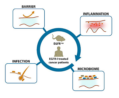 A team of dermatologist, led by Dr. Gerber from Germany and a team of immunologists, led by Dr. Bauer from Austria could recently clarify the events induced by EGFR-I in the skin. The hallmarks of the epidermal inflammation could be identified as a barrier disruption at the hair follicle followed by a bacterial invasion. The current project now aims to clarify the mechanisms behind the breakdown of the skin barrier and the anti-microbial defense, identify the responsible microorganisms and characterize in detail the compositional shifts in the skin microbiota.