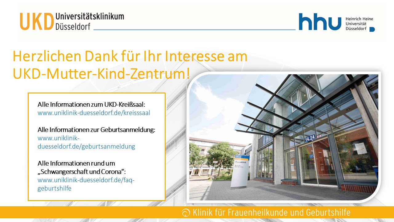 Due to a rising demand, the Clinic is glad to be able to offer special editions of these digital tours in English for international guests. They are free of charge and will also be digital – attendees can join while staying comfortably at home. Dates for further events will be uploaded here. The Online-Event will be hosted by the UKD-Medical Experts and will introduce attendees to our holistic approach to caring for pregnant women and newborns. Moreover, our staff will provide practical advice on pregnancy and childbirth - and of course answer individual questions.