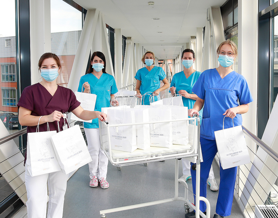 Mit „Milchtüten“ machten die Teams unseres Kreißsaals, der Wöchnerinnenstation, des Kindersaals und der Stationen der Klinik für Allgemeine Pädiatrie, Neonatologie und Kinderkardiologie KK05 und KI06 zur Weltstillwoche auf das Thema Stillen aufmerksam. Die Tüten enthalten kleine Überraschungen für junge Mütter – und für die Teams, die diese betreuen.
