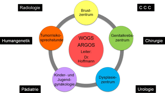 - Im eigenen Fach der Gynäkologie bestehen enge, synergistische Beziehungen zum Dysplasiezentrum , zum Genitalkrebszentrum , dem interdisziplinären Brustzentrum , der Kinder- und Jugendgynäkologie und selbstverständlich auch fachübergreifende Beziehungen zur Radiologie, Urologie, Chirurgie und Kinderheilkunde.
