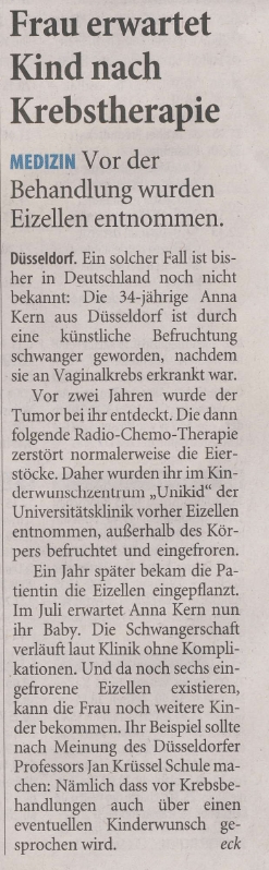 Erste - laut Netzwerk Fertiprotekt - Schwangerschaft nach Krebsbehandlung in Deutschland bei fertilitätsprotektiven Maßnahmen im Rahmen der Krebstherapie: